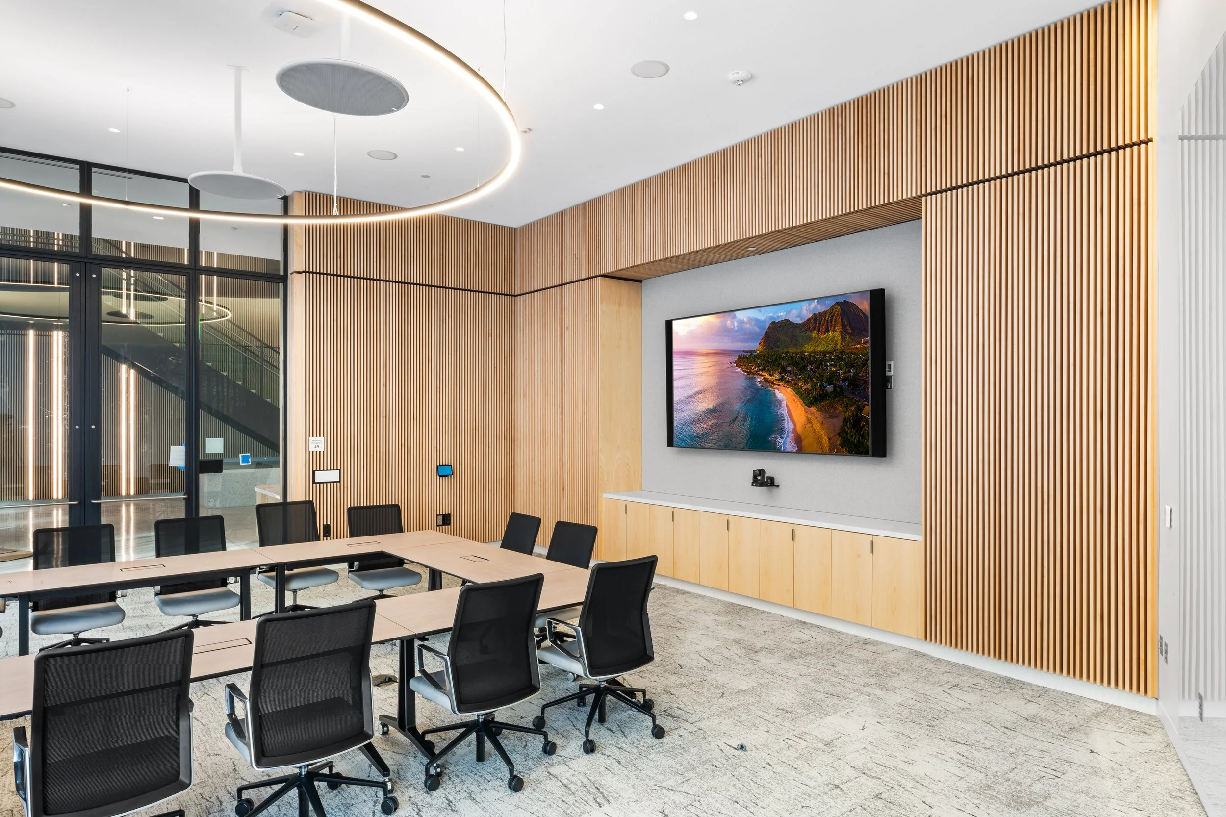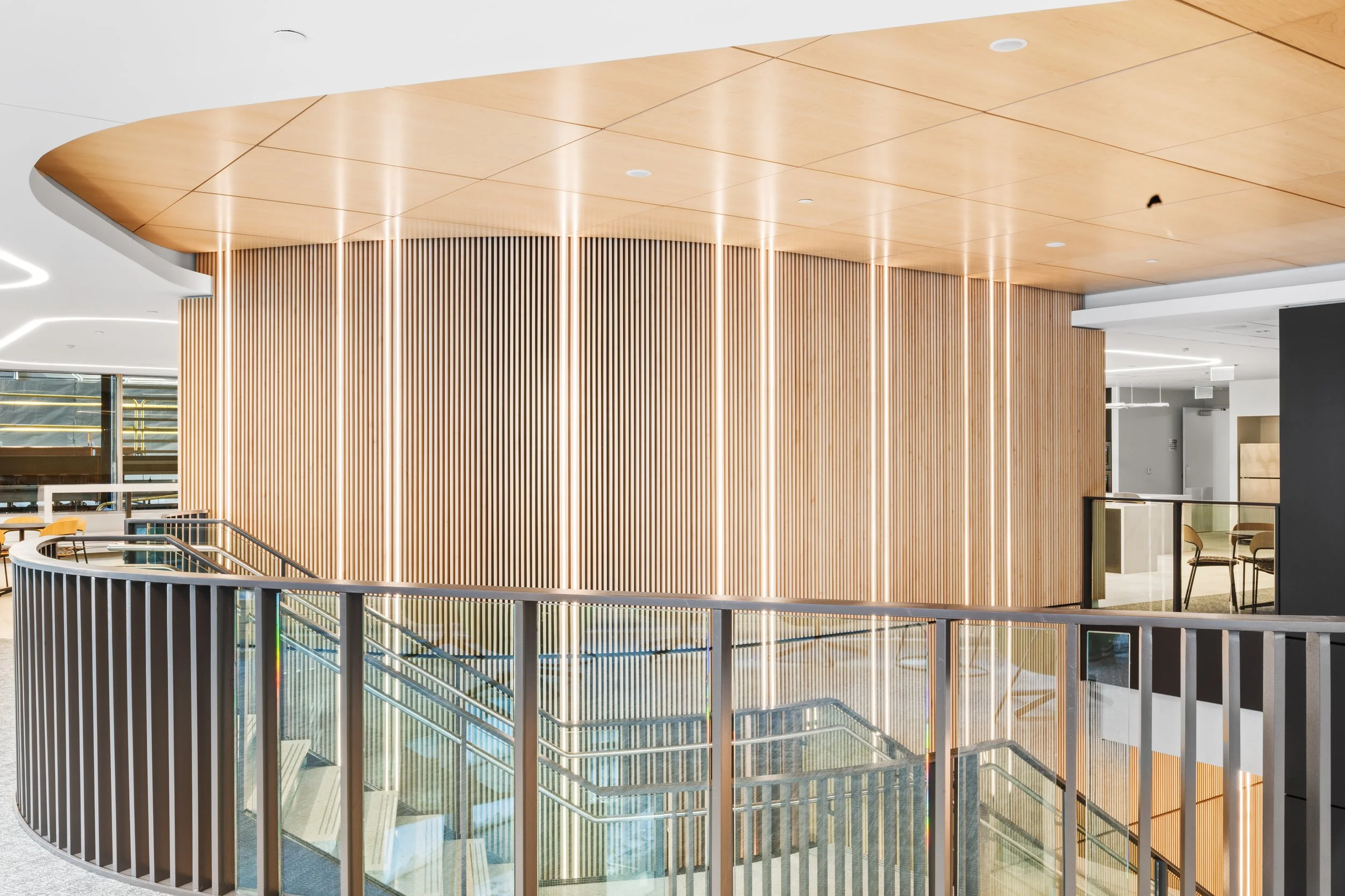 Our scope of work included the installation of custom wood wall paneling, curved millwork assemblies, column wraps, integrated seating, and architectural feature elements throughout public and circulation spaces. Each component was installed with careful attention to alignment, consistency, and finish quality to ensure seamless integration with surrounding materials. The completed interiors reflect a refined, modern aesthetic while meeting the durability and performance demands of a high-use research facility.